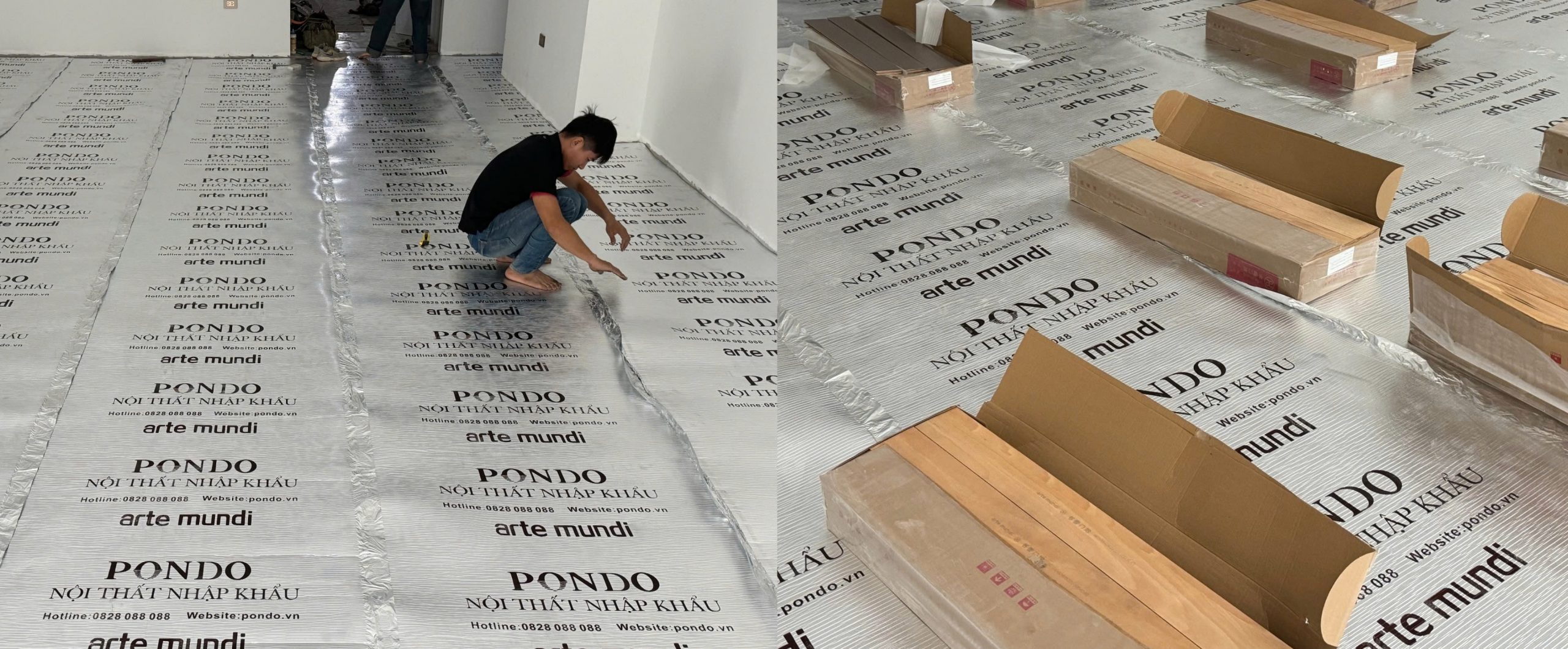 Hình ảnh Trải thảm lót IXPE và Chuẩn bị vật tư trước khi chính thức thi công