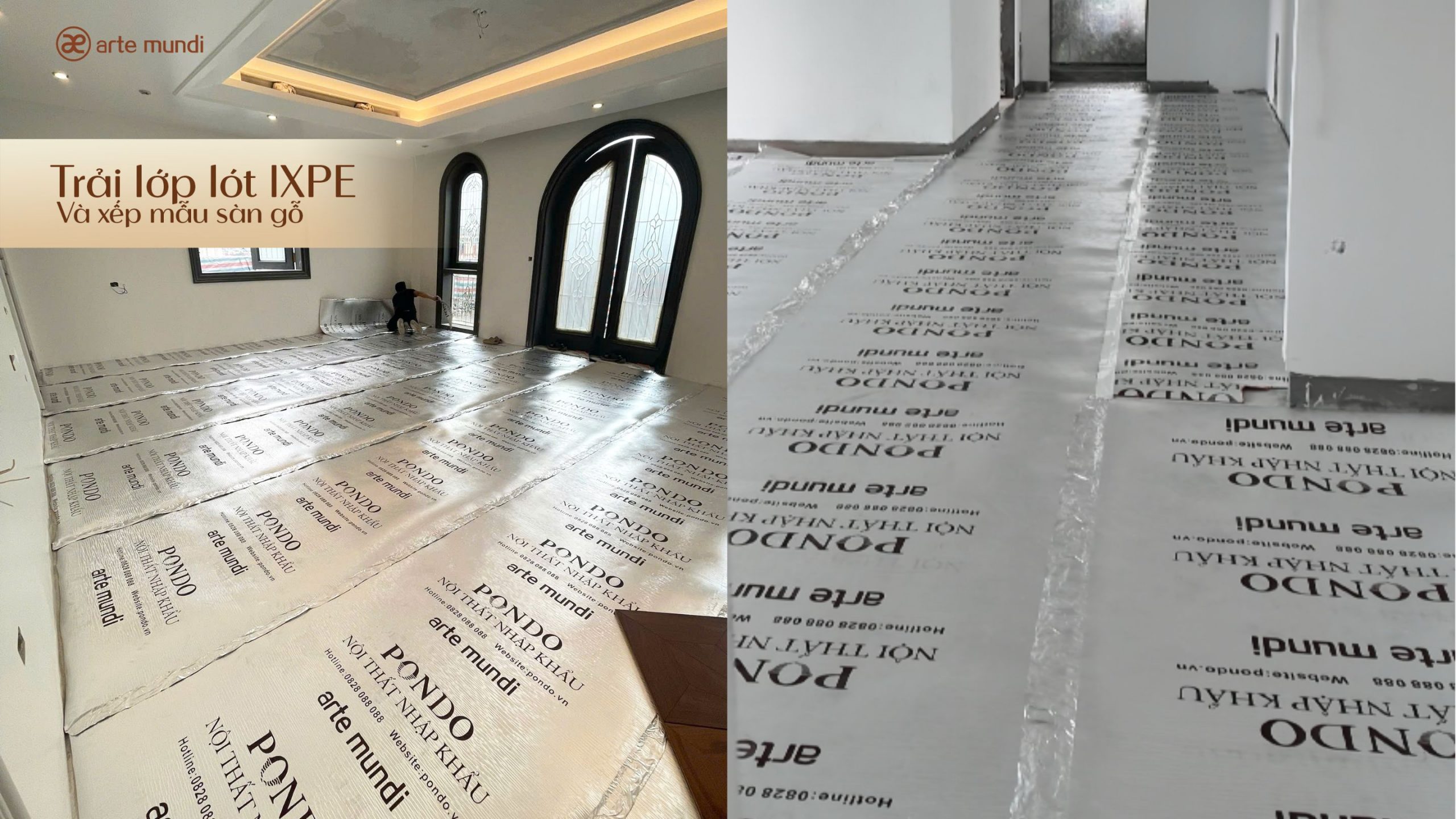 Trong khi đó, tấm lót IXPE của Arte Mundi dùng là loại được bố trí keo dán 2 mặt ở các đầu của mỗi tấm. Như vậy khi giao nhau, phần giấy bạc sẽ được kết nối chặt chẽ với nhau một cách kín đáo. Sẽ không có kẽ hở nào để hơi ẩm từ nền nhà bay lên sàn gỗ. Đảm bảo sàn gỗ được bảo vệ an toàn từ các tác nhân đến từ nền nhà bê tông.